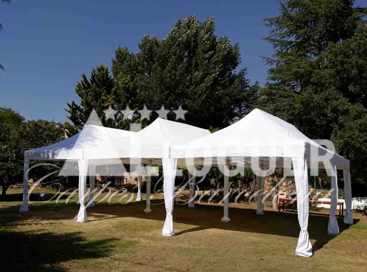 Tres carpes de lloguer de 8x4m configuren aquest espai que va donar cobertura a un convit nupcial. Decorades amb cobreix puntals en les seves potes i amb un blanc immaculat, amb un material net i impecable.